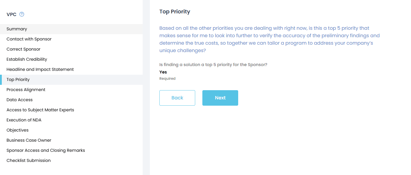 The Value Priority Call is embedded in the sales process and confirms senior buy-in early.