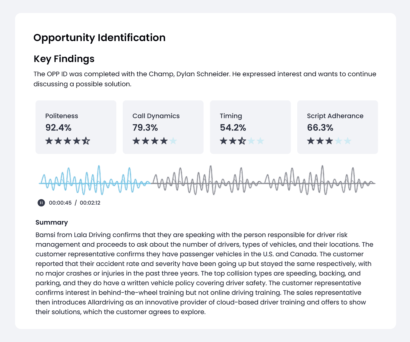 Each call is evaluated using AI across key factors such as politeness, call dynamics, and script adherence to highlight both strengths and opportunities for improvement.